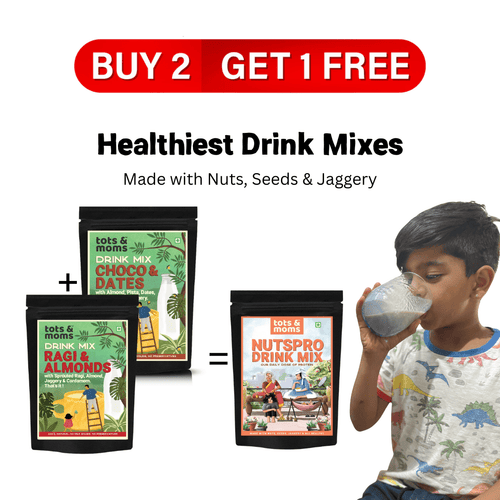 Most famous Drink Mixes meant for younger children, claiming and boasting to make them stronger, taller, wider, come with a minimum of 30% sugar, 30% more milk powder and miniscule amount of ingredients we have heard or we understand. Health is not about growing visibly, it is internal and hence it is good to feed Natural.
