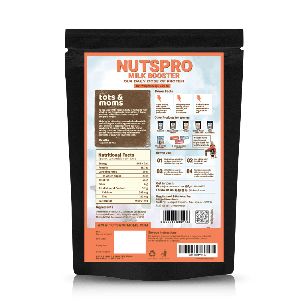 Tots and Moms Nutspro Milk Booster is a blend of 7 superfood seeds and Jaggery. It is a rich source of plant-based proteins, healthy fats, omega-3 fatty acids, calcium and magnesium. Consumption of Nutspro Milk Booster during pregnancy helps in the baby's brain, eyes, and nervous system development. It supports the immune system and promotes milk production in lactating Mothers.