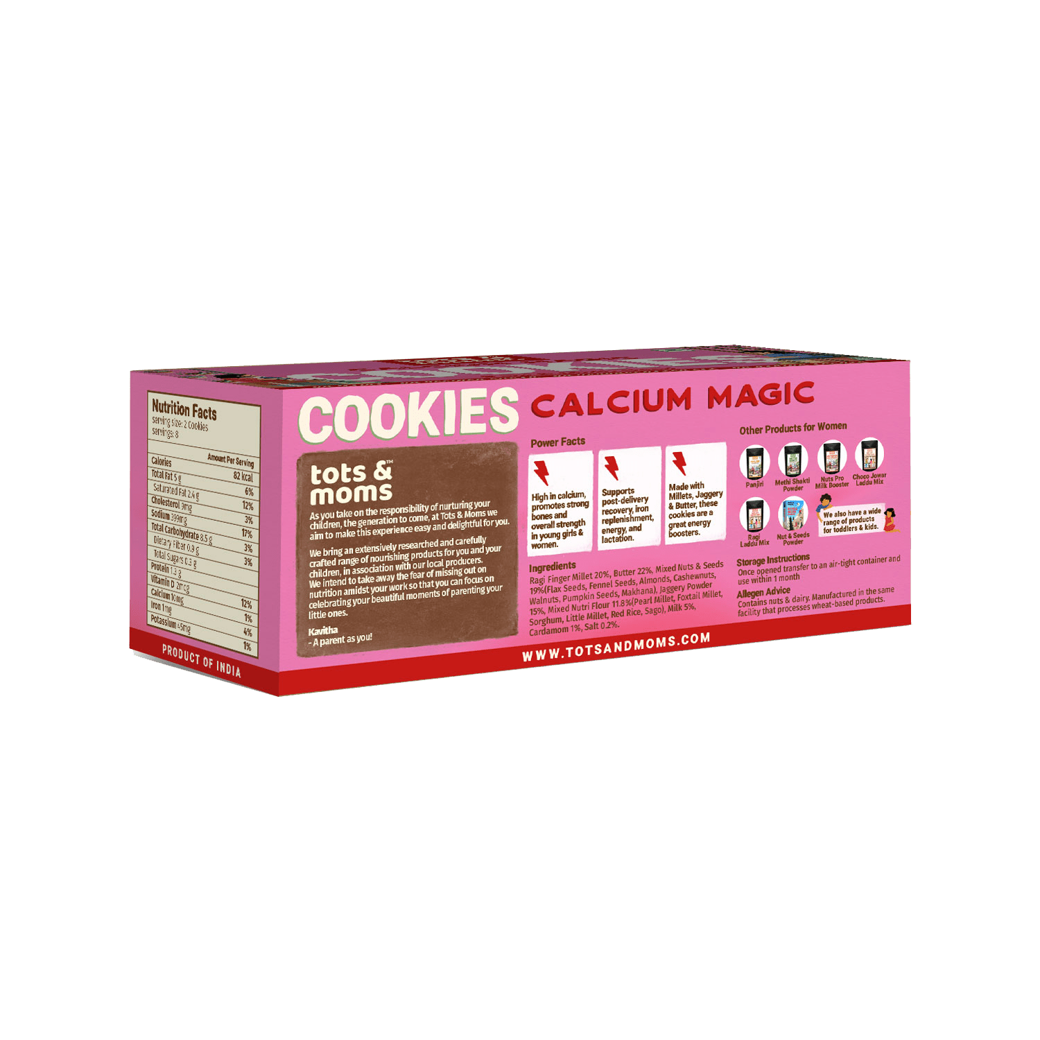 Calcium magic Cookies: Ragi Finger Millet 20%, Butter 22%, Mixed Nuts & Seeds 19%, (Flax Seeds, Fennel Seeds, Almonds, Cashewnuts, Walnuts, Pumpkin Seeds, Makhana), Jaggery Powder 15%, Mixed Nutri Flour 11.8%, (Pearl Millet, Sorghum, Little Millet, Red Rice, Sago),Milk (5%), Salt (0.2), Cardamom (1%)