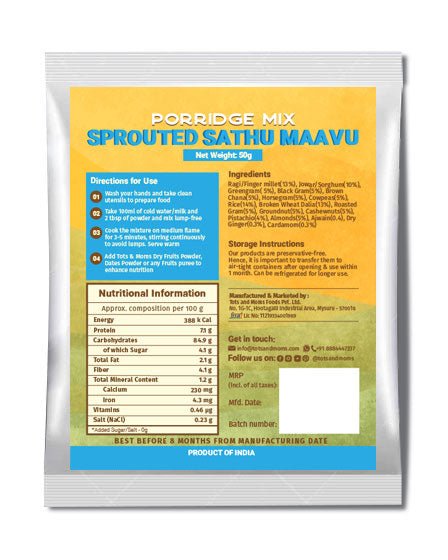Sprouted Sathu Maavu : Ragi/Finger millet(13%), Jowar/Sorghum(10%), Greengram( 5%), Black Gram(5%), Brown Chana(5%), Horsegram(5%), Cowpeas(5%), Rice(14%), Broken Wheat Dalia(13%), Roasted Gram(5%), Groundnut(5%), Cashewnuts(5%), Pistachio(4%), Almonds(5%), Ajwain(0.4), Dry Ginger(0.3%), Cardamom(0.3%)