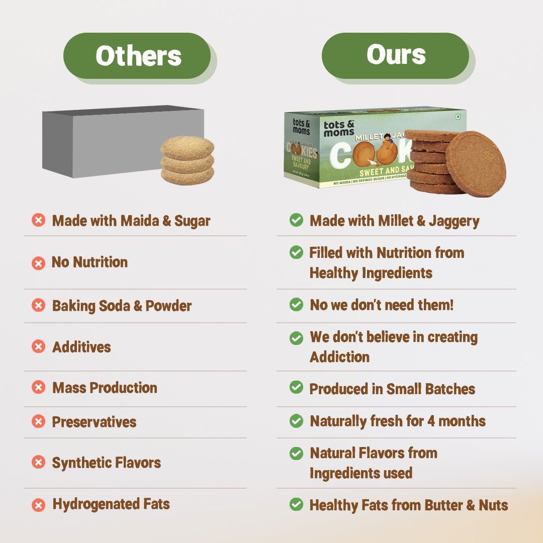 Tots and Moms Sweet & Savoury Millet Jaggery Cookies, one of the healthy snacking options is made of 100% natural and high-quality ingredients. It is created by a Mom with 10+ years of industry expertise. No chemicals, no preservatives, no sugar, no artificial flavors, no additives are used. It is manufactured under the utmost hygienic conditions. We are pioneers in clean range & 100% label display